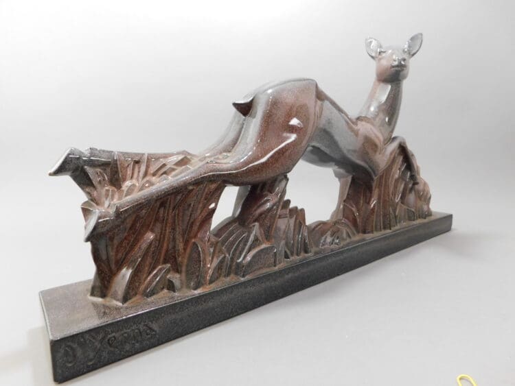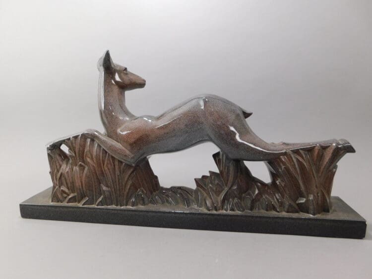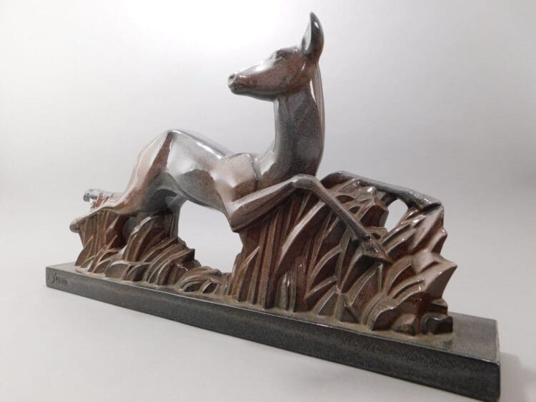 French ceramic deer with speckled grey and red glaze, signed J. Yerna to the front of the base and made in Bordeaux.