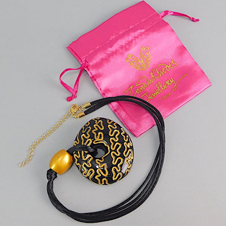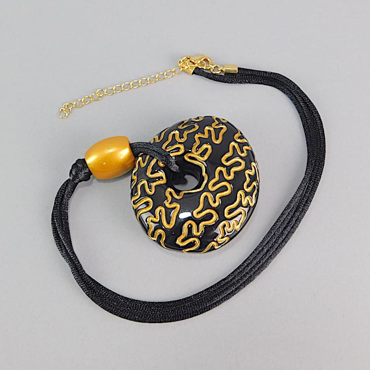 Brown and gold wiggle design phenolic pendant on a cord. Made in a limited edition.