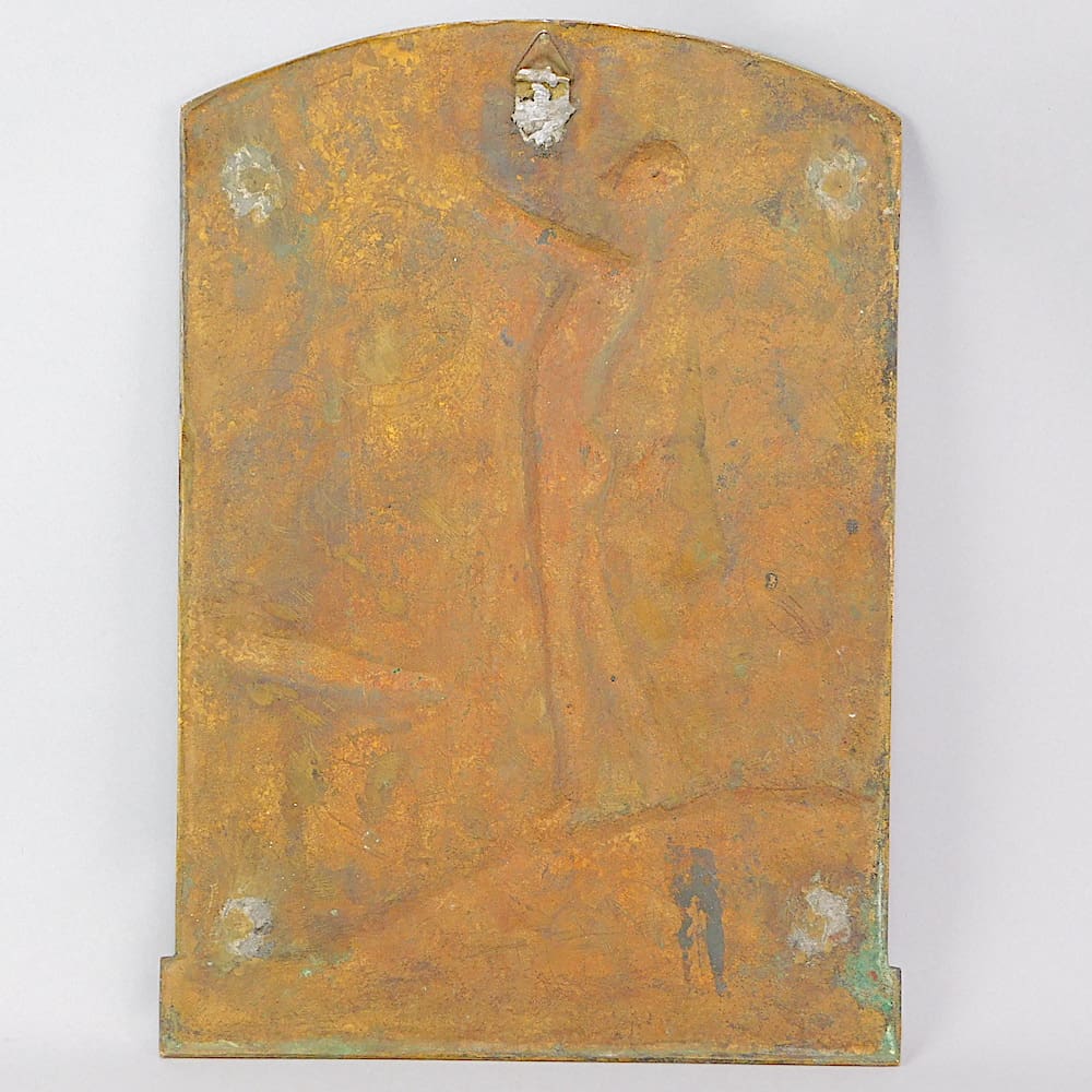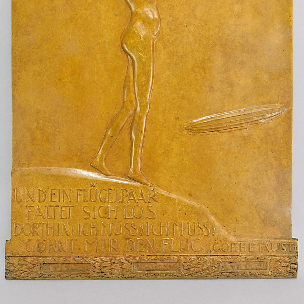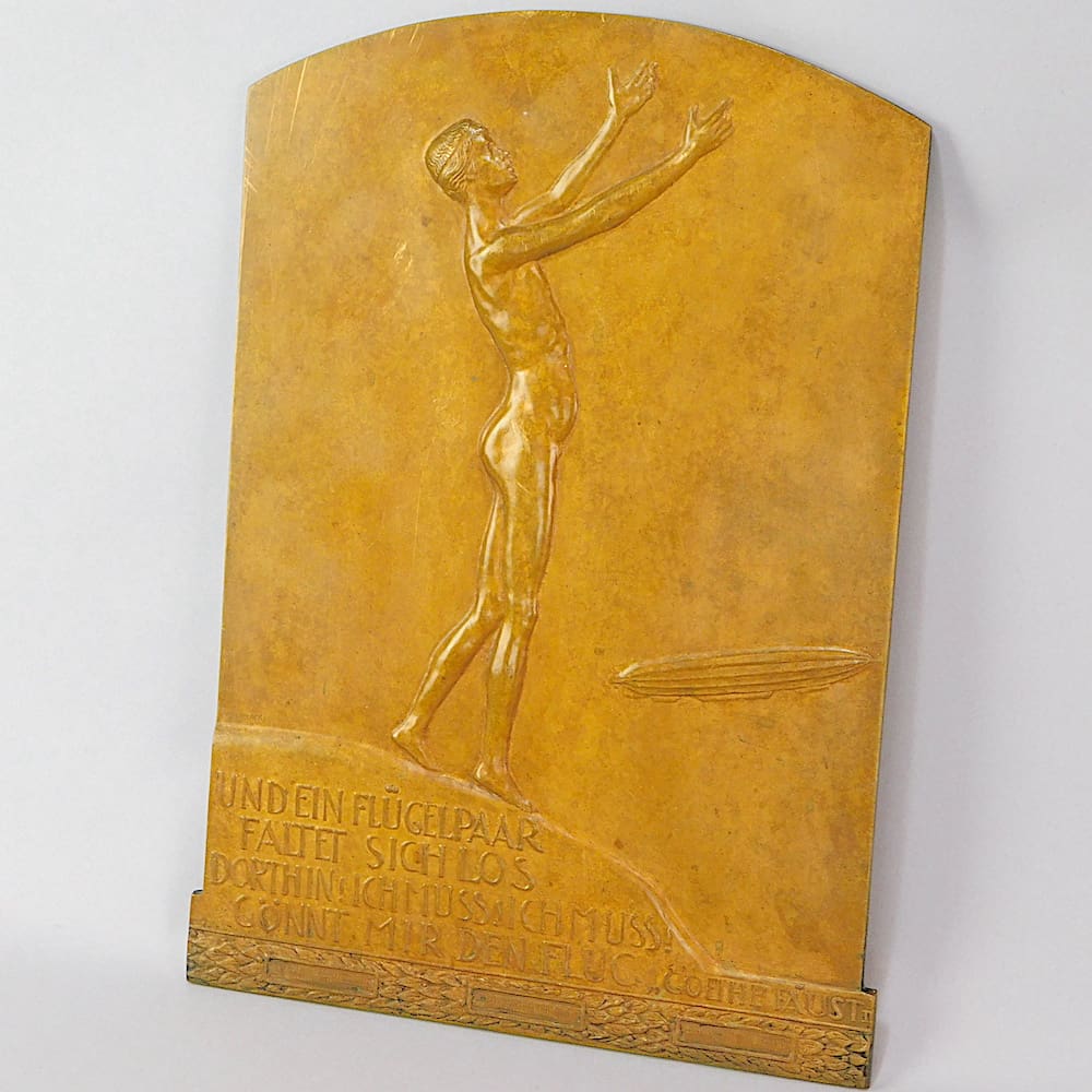 German copper or bronze art deco panel depicting a man and blimp or airship.