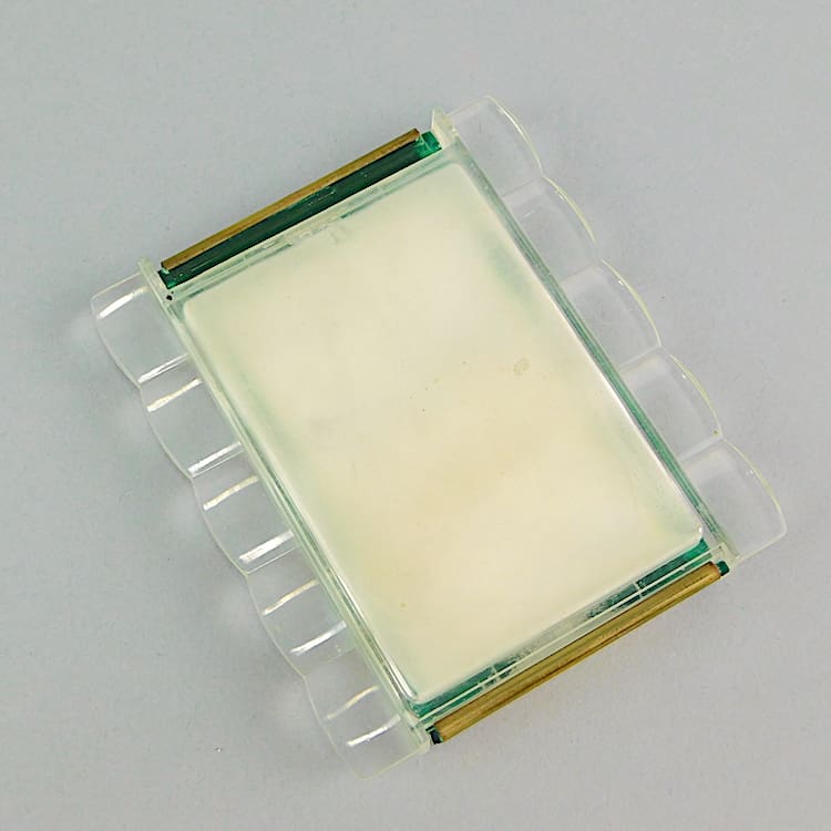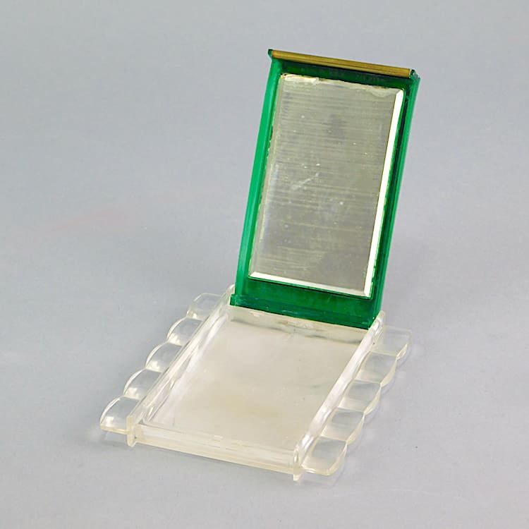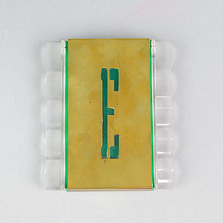 Gilt metal and green and clear lucite powder compact. I believe made by Ziegfeld. To the lid is the letter E for the ladies name presumably. Inside the lid is a mirror.
